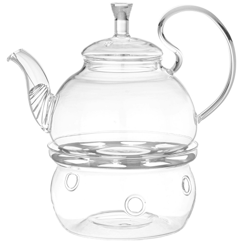 Заварочный стеклянный чайник выполнен в элегантной форме с изысканной ручкой.