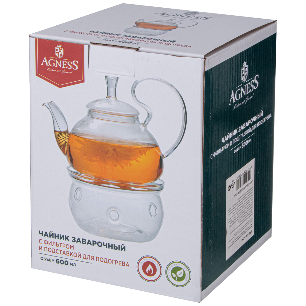 ЧАЙНИК ЗАВАРОЧНЫЙ AGNESS С ФИЛЬТРОМ ИЗ НЖС И СТЕКЛ. ПОДСТАВКОЙ ДЛЯ ПОДОГРЕВА 600 МЛ (КОР=18 НАБОР.)