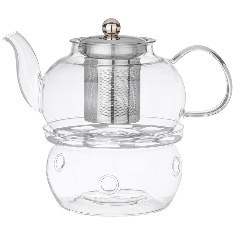 Заварочный стеклянный чайник выполнен в элегантной форме с изысканной ручкой.