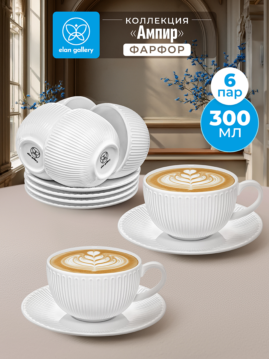Чайный набор Elan Gallery "Ампир Нуво" состоит из 12 предметов. Выполнен из белого фарфора и украшен лаконичным рельефом. Ритмичный, архитектурный узор продолжает эстетику, вдохновлённую стилем ампир, и переосмысляет её в новом ключе. Комплект можно использовать как кофейный или для сервировки любых других напитков. В состав набора входят 6 чашек объёмом 300 мл и размером 13х10х6,5 см каждая, 6 блюдец размерами 16х16х2 см. Фарфоровый набор на шесть персон подходит для любителей чая и кофе. Вы сможете насладиться любимыми напитками из красивой кружки и удивить своих гостей. Используйте блюдце как подставку под чашку. Положите на тарелочку кусочек торта, домашнего пирога или пирожное. Сервировочная тарелка подойдёт не только для десерта, но и закусок: сырной нарезки, сырокопчёной колбасы или свежих овощей и зелени. Посуда из фарфора украсит интерьер вашей кухни. Разместите на блюдце кусочки шашлыка или бутерброды, чтобы перекусить за чашечкой кофе. Беречь от механических повреждений и резких перепадов температур. Не рекомендуется применять абразивные моющие средства. Можно использовать в микроволновой печи и мыть в посудомоечной машине. Поставляется в картонной коробке. Фарфоровая посуда – приятный подарок на любой праздник. Благодаря красочной коробочке не понадобится подарочная упаковка. В коллекции бренда Элан Галерея представлено много красивого кофейного и чайного инвентаря, выберите сервиз на свой вкус. Набор 6 чайных пар станет украшением праздничного стола или добавит эстетики ежедневному чаепитию! /