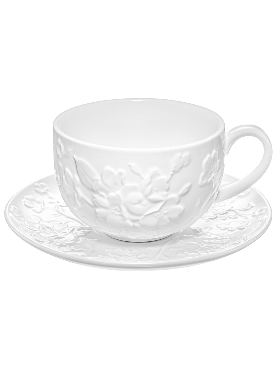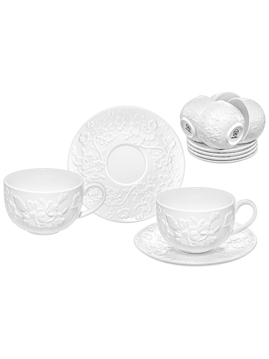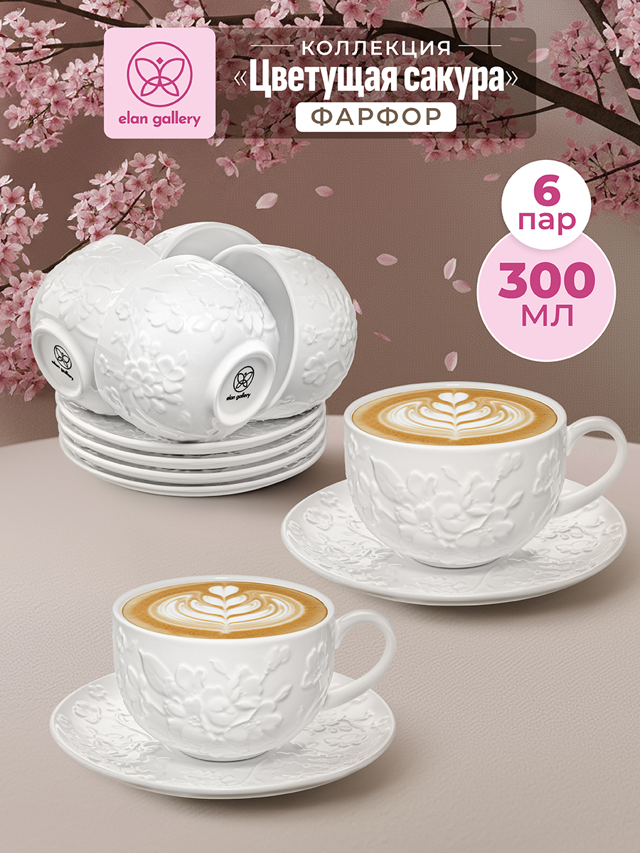 Чайный набор Elan Gallery "Цветущая сакура" состоит из 12 предметов. Выполнен из белого фарфора и украшен изящными рельефными узорами с цветами. Можно использовать как кофейный или для сервировки любых других напитков. В состав набора входят 6 чашек объёмом 300 мл и размером 13х10х6,5 см каждая, 6 блюдец размерами 16х16х2 см. Фарфоровый набор на шесть персон подходит для любителей чая и кофе. Вы сможете насладиться любимыми напитками из красивой кружки и удивить своих гостей. Используйте блюдце как подставку под чашку. Положите на тарелочку кусочек торта, домашнего пирога или пирожное. Сервировочная тарелка подойдёт не только для десерта, но и закусок: сырной нарезки, сырокопчёной колбасы или свежих овощей и зелени. Посуда из фарфора украсит интерьер вашей кухни. Разместите на блюдце кусочки шашлыка или бутерброды, чтобы перекусить за чашечкой кофе. Беречь от механических повреждений и резких перепадов температур. Не рекомендуется применять абразивные моющие средства. Можно использовать в микроволновой печи и мыть в посудомоечной машине. Поставляется в картонной коробке. Фарфоровая посуда – приятный подарок на любой праздник. Благодаря красочной коробочке не понадобится подарочная упаковка. В коллекции бренда Элан Галерея представлено много красивого кофейного и чайного инвентаря, выберите сервиз на свой вкус. Набор 6 чайных пар станет украшением праздничного стола или добавит эстетики ежедневному чаепитию!