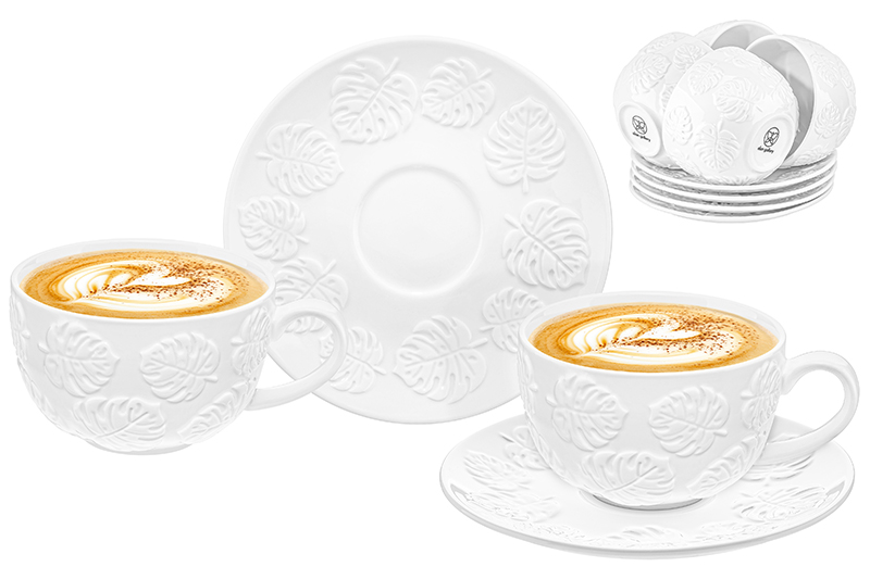Чайный набор Elan Gallery "Тропики" состоит из 12 предметов и выполнен из белого фарфора в классическом дизайне. В комплект входят 6 чашек объёмом по 300 мл и 6 блюдец размерами по 16х16х1,8 см. Посуда серии украшена рельефным узором в виде тропических листьев. Набор на шесть персон подходит для любителей чая и кофе. Можно использовать как кофейный комплект для элегантной сервировки. Вы сможете насладиться своими любимыми напитками из чашки с изящным рельефным узором и удивить гостей на чаепитии. Используйте блюдце как подставку под чашку. Положите на тарелочку кусочек торта, домашнего пирога или пирожное. Сервировочная тарелка подойдёт не только для десерта, но и закусок: сырной нарезки, сырокопчёной колбасы или свежих овощей и зелени. Посуда из белого фарфора идеально впишется в любой интерьер вашей кухни. Разместите на блюдце кусочки шашлыка или бутерброды, чтобы перекусить за чашечкой кофе. Избегать резких перепадов температур и беречь от механических повреждений. Не рекомендуется применять абразивные моющие средства. Можно использовать в микроволновой печи и мыть в посудомоечной машине. Поставляется в картонной упаковке. Фарфоровая посуда – хороший вариант подарка любой женщине. Особенно понравится любителям посуды в скандинавском стиле. Серия "Тропики" позволит собрать сервиз в едином стиле и станет украшением вашего дома.