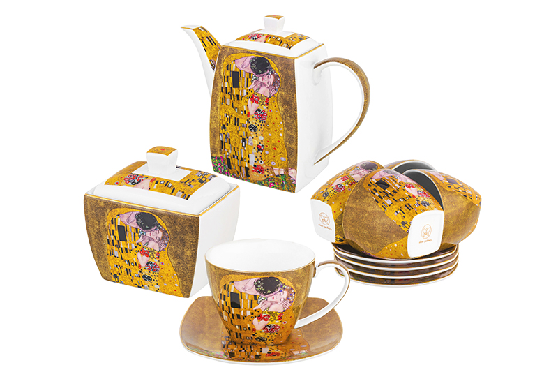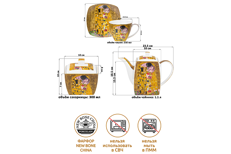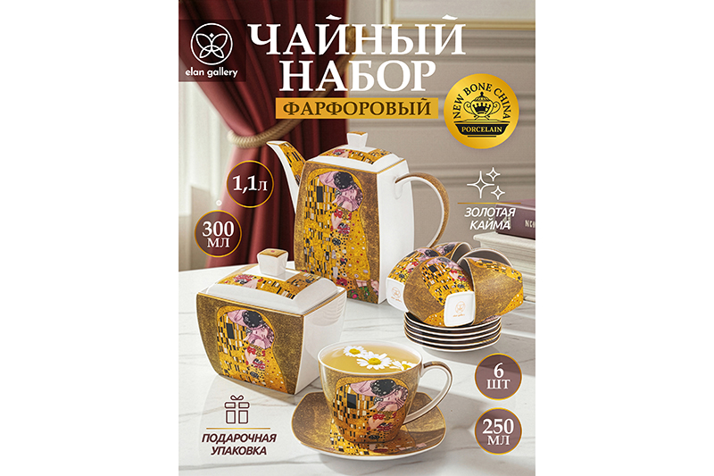 Чайный набор серии "Поцелуй" состоит из 14-ти предметов: 6 чашек объемом по 250 мл, 6 блюдец диаметром по 14 см, чайник на 1,1 литра и сахарница на 300 мл. Набор поможет провести множество приятных чаепитий. Посуда в наборе украшена роскошными репродукциями картины Густава Климта "Поцелуй" и обрамлена золотым окаймлением. Посуда выполнена из высококачественного фарфора New Bone China. Это фарфор нового поколения, не уступающий традиционному костяному по качеству, но при этом гораздо более экологичный в производстве. Чайник в носике имеет фильтрующие отверстия против чаинок. Крышка чайника удерживается с помощью язычка. Набор не подходит для использования в микроволновой печи и посудомоечной машине. Поставляется в подарочной упаковке. Чайный набор из серии посуды "Поцелуй" сможет стать настоящим украшением кухни или приятным подарком для ваших родных и близких!