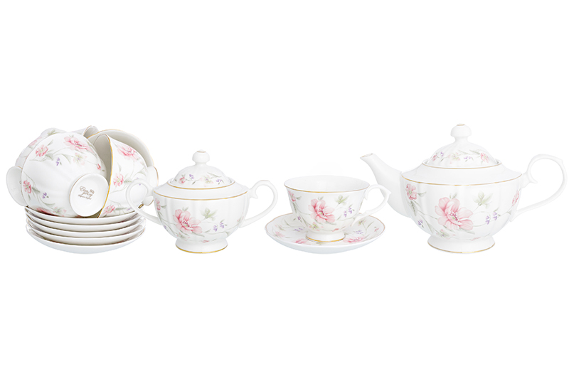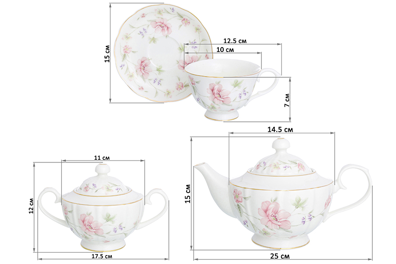 Чайный набор из серии «Диана» от Elan Gallery предназначен для эстетичной сервировки вашего стола. Включает в себя чайник, сахарницу и 6 чайных пар. Выполнены из фарфора нового поколения new bone china, сочетающего в себе изящность и высокую прочность. Такие изделия легко отмываются, поэтому сохраняют привлекательный вид и практичны в использовании. От других видов костяного фарфора new bone china отличается большей экологичностью в производстве. Поверхность изделий украшает воздушный цветочный рисунок и элегантное золотое окаймление. Размер чайника – 25х14,5х15 см, объём – 1 литр. Фильтр в виде маленьких отверстий в стенке позволит наслаждаться ароматной заваркой без попадания мелких чаинок. Крышка прочно держится на заварнике благодаря язычку. Размер сахарницы – 17,5х11х12 см, объём – 450 мл. Подойдёт для хранения сахара, соли, специй и приправ. Засыпьте внутрь чай или кофе, приспособьте под варенье, мёд или икру. Ручки позволят удобно переносить её и подавать к столу. Размер каждой кружки – 12,5х10х7 см, объём – 250 мл. Размер каждого блюдца – 15х15х2,5 см. Набор поможет вам провести множество приятных завтраков с кофе, а также уютные чайные вечера. Согрейтесь зимой любимым напитком: какао с маршмэллоу, ягодным чаем, горячим шоколадом. Летом освежитесь домашним лимонадом и морсом. Используйте сервировочные блюдца как подставки для чашек или заполните сладостями и закусками. Благодаря нежному дизайну комплект впишется в интерьер любой кухни, гостиной или столовой. Не рекомендуется применять абразивные моющие средства. Не использовать в посудомоечной машине и микроволновой печи. Поставляются в дизайнерской картонной коробке – благодаря ей вам не потребуется дополнительная подарочная упаковка. Фарфоровая сервировочная посуда будет оригинальным подарком для хозяйки, ценящей не только практичность, но и привлекательность. Серия «Диана» от бренда Элан Галерея подарит вам ощущение мечтательной лёгкости!