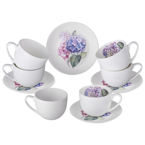 Коллекция включает наборы посуды, обеденные и закусочные тарелки, кружки, салатники, чайные пары и чайные наборы. Каждый предмет достоин стать подарком по любому поводу, а несколько предметов коллекции создадут неповторимый интерьер и настроение. Выбирайте и дарите предметы этой коллекции по любому случаю Вашим любимым, родным и знакомым. Гортензии очаровательны. При дарении они точно вызовут массу положительных эмоций и будут оценены по достоинству.