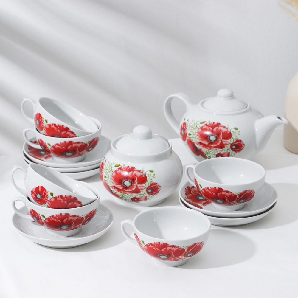 Чайный сервиз 14 предметов "Маки"Классический чайный набор станет украшением стола к приходу гостей.Набор выполнен из качественного фарфора.В состав набора входят:• Чайник 800 мл - 1 шт,• Сахарница 500 мл - 1 шт,• Чашка чайная 220 мл - 6 шт,• Блюдце 14 см - 6 шт.Заключаем договора по 44 ФЗ, 223 ФЗ