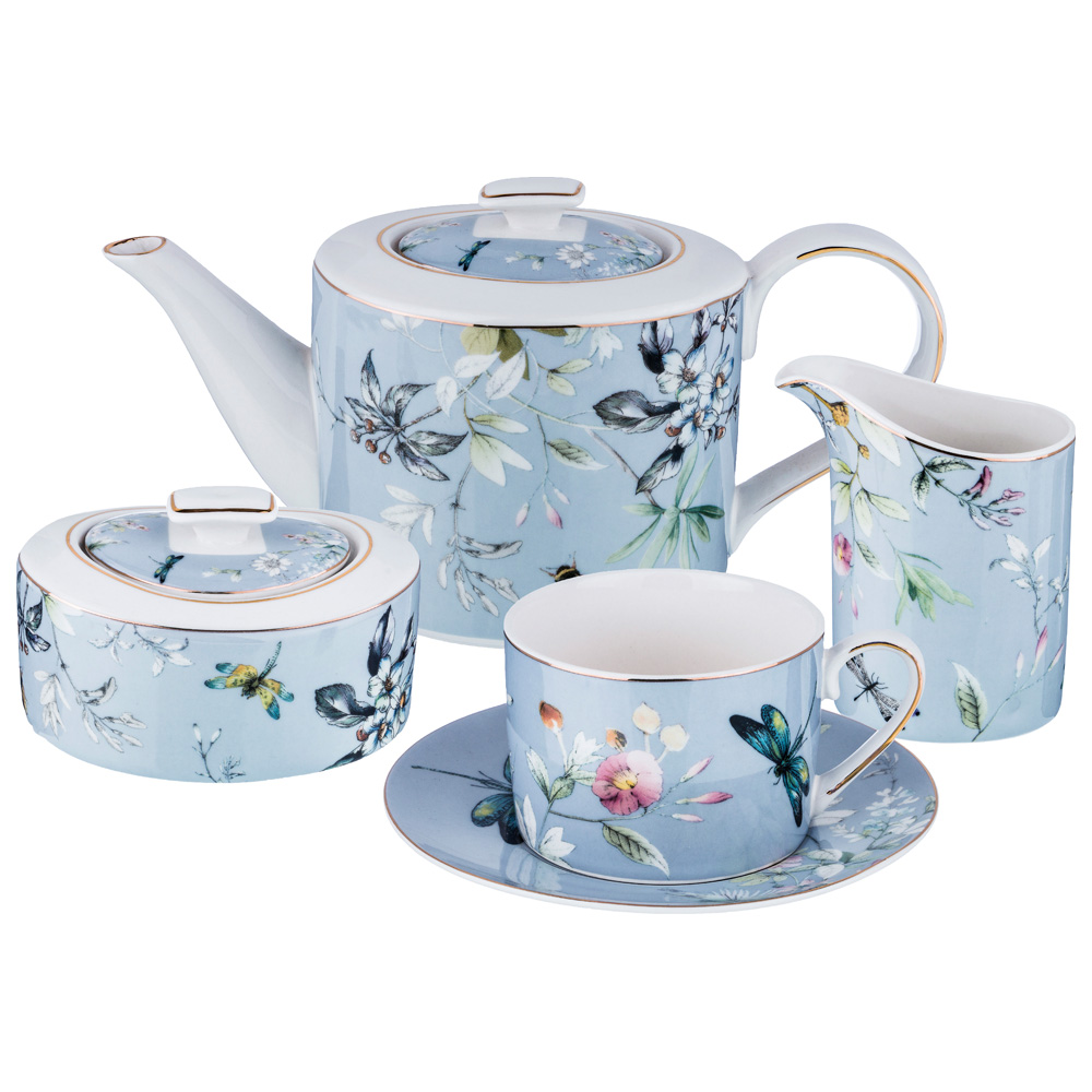 TM Lefard коллекция "Блоссом" - это уникальный и запоминающийся дизайн. Луговые цветы на фоне утреннего нежно-голубого неба - это летнее настроение на Вашей кухне круглый год. Удобные формы и качественный тонкостенный фарфор делают посуду коллекции "Стрекоза" прекрасным подарком к любому торжеству. Продукция прошла сертификацию и безопасна для контакта с пищевыми продуктами. Не использовать в микроволновой печи, не рекомендуется мыть в посудомоечной машине. Комплектность: чайник 900 мл, сахарница 300 мл, молочник 200 мл, 6 чашек 250 мл, 6 блюдец.