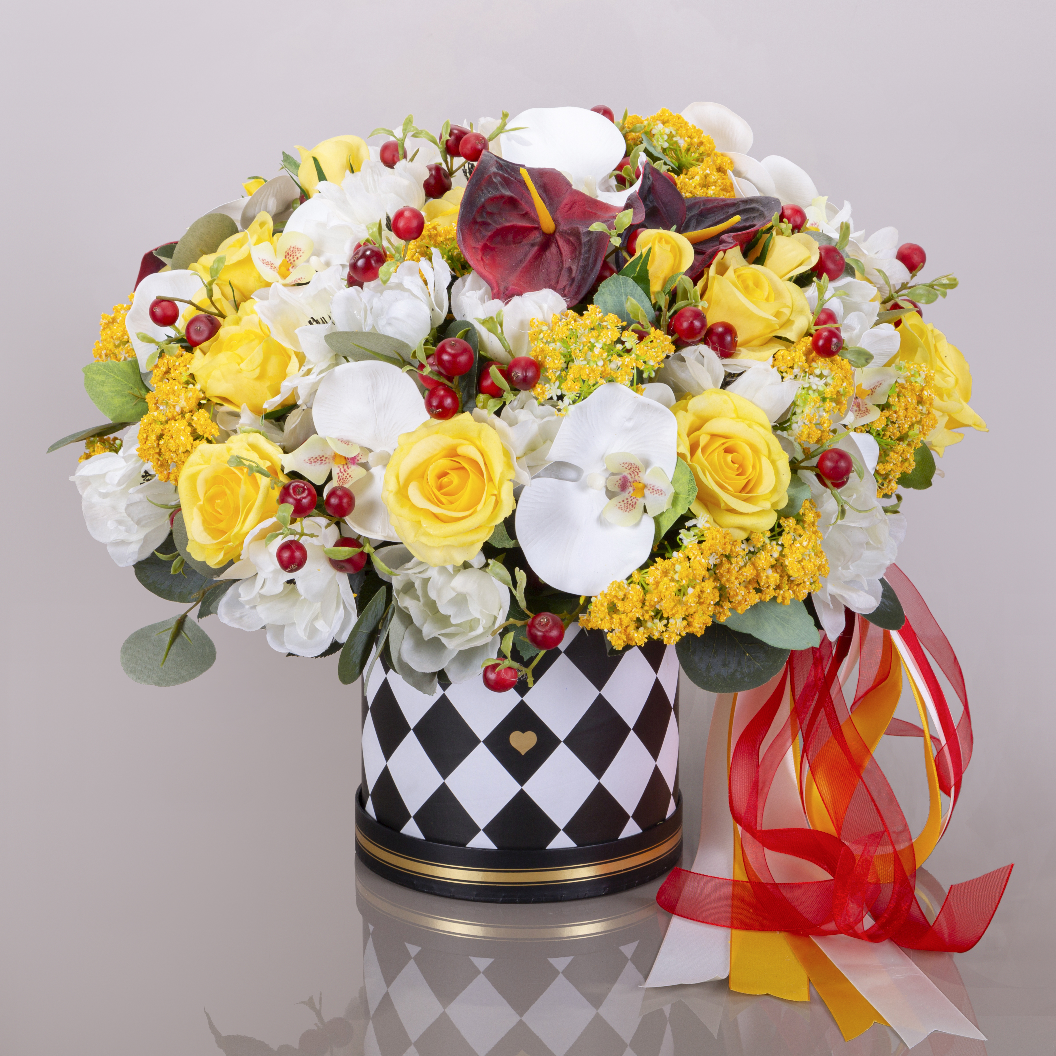 ЦВЕТОЧНАЯ КОМПОЗИЦИЯ В КОРОБКЕ "CALDO" ШИРИНА 44см*ВЫСОТА44см- БЕЗ УПАКОВКИ