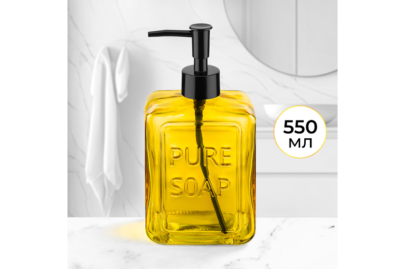 Диспенсер Elan Gallery "Жёлтый" объёмом 550 мл и размером 6х9,5х19,5 см поможет организовать чистоту и уют в вашем доме. Выполнен из стекла и украшен надписью "Pure soap" ("Чистое мыло"). Объём стеклянной бутылочки 550 мл позволит налить в неё достаточно средства, чтобы хватило для длительного использования. Дозатор диспенсера выполнен из пластика. Поскольку бутылка изготовлена из прозрачного стекла, вы можете контролировать уровень жидкости и вовремя пополнять её запас. Стильный органайзер подойдёт для использования на кухне или в ванной комнате. Налейте в него моющее средство, гель для мытья посуды или жидкое мыло. Эргономичная форма позволяет разместить флакон с дозатором на раковине или полке. В ванной можете использовать его для геля для душа или шампуня. Универсальную бутылочку с дозатором можно приспособить под антисептик. Просто поставьте её на стол, чтобы средство для дезинфекции было всегда под рукой. Ёмкость квадратной формы выполнена в стильном дизайне и подойдёт для любого интерьера. Инструкция: не применять абразивные моющие средства. Избегать регулярного прямого контакта с водой (например, не хранить в душевой кабинке или на полке возле душа). Поставляется в картонной упаковке. Настольный диспенсер — это не только практичное, но и стильное решение для организации чистоты и порядка в вашем доме. /