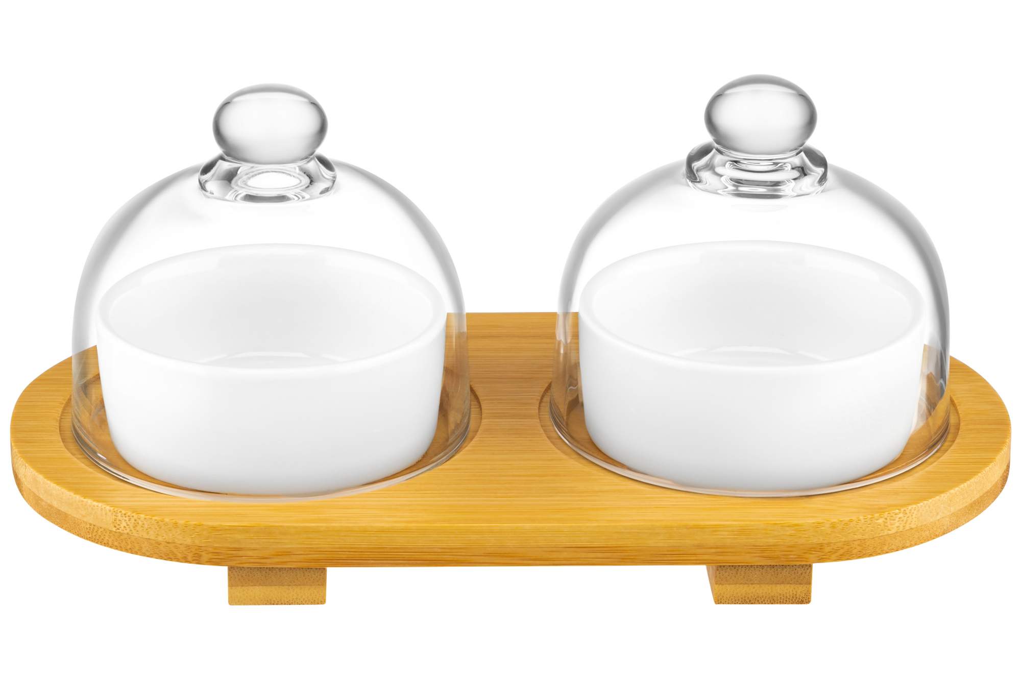 БЫЛО 1028 руб! Набор 2 блюд 22*11*9,5 см "Айсберг" + стеклянные крышки + дер.подставка