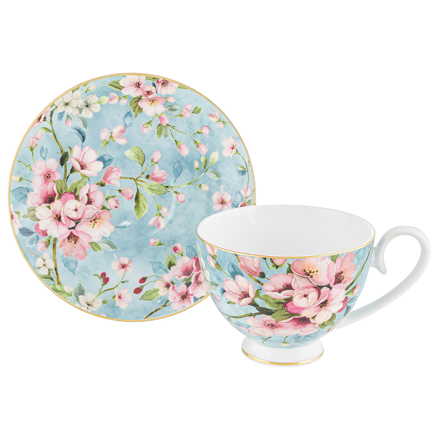 БЫЛО 1033 руб! Чайная пара 2 пр. 300 мл 12,5*9,5*7 см "Яблоневый цвет на голубом" на ножке, фарфор NEW BONE CHINA