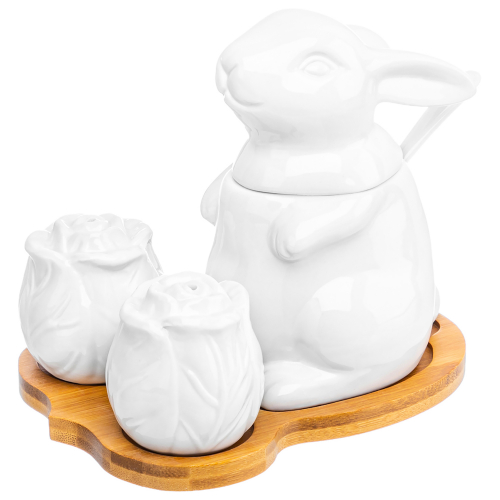 БЫЛО 1100 руб! Набор 3 пр. - Сахарница 200 мл 15,5*11,5*13 см "Заяц с капустой" с ложк.+солонка+перечн.на дер.подст
