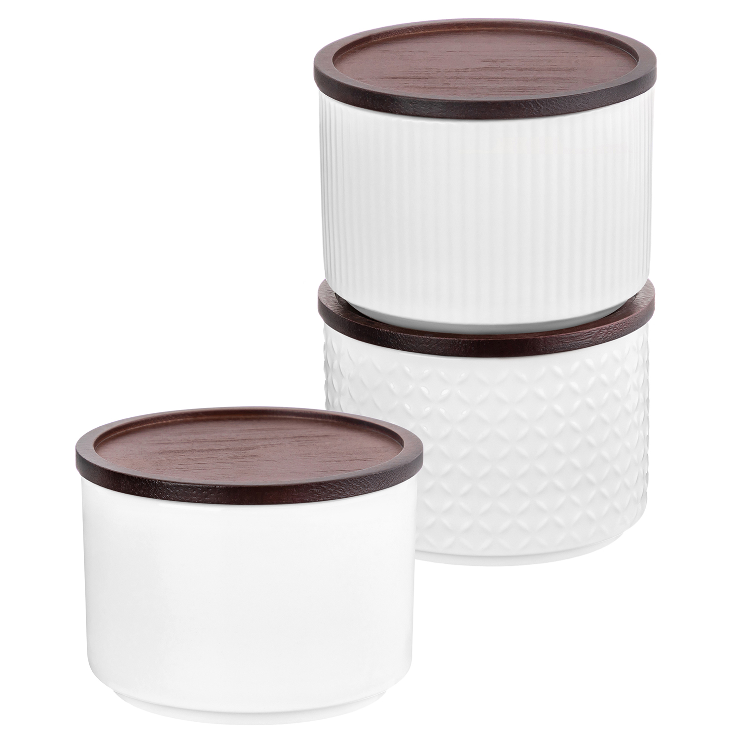 БЫЛО 1112 руб! Набор банок д/хранения и запекания 3 пр. 250 мл 9,3*9,3*7 см "Микс" + дер.крыш-подст. с сил/упл. бел