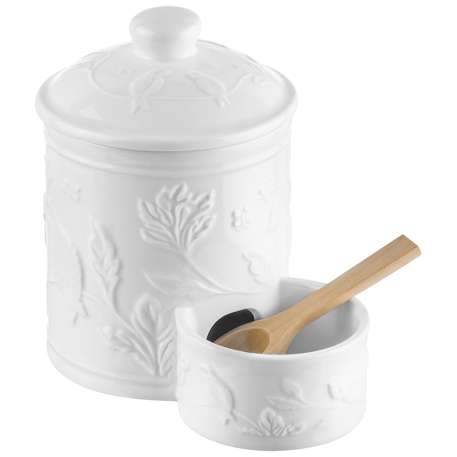 БЫЛО 1125 руб! Банка д/соли 500 мл 15,5*10*14,5 см "Птички на ветке" с деревянной ложкой и крышкой