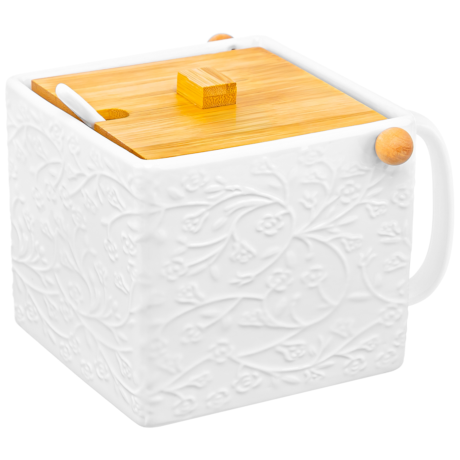 БЫЛО 1138 руб! Банка д/сыпучих продуктов 1 л 16,5*15*12 см "Веточки-цветочки" с ложкой и бамбуковой крышкой, фарфор
