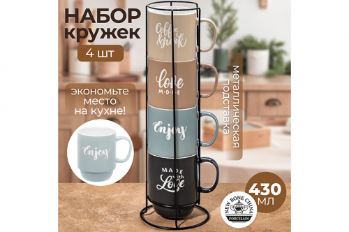 БЫЛО 1385 руб!! Набор кружек 4 пр. 430 мл 12,5* 8,5*11 см "Настроение" на метал. подставке, фарфор NEW BONE CHINA