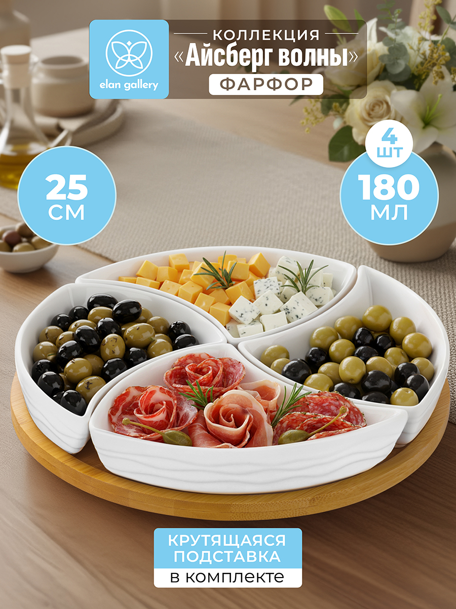 БЫЛО 1388 руб! Менажница 25*25*6 см "Айсберг волны" крутящ. 4 секции на дерев. подставке