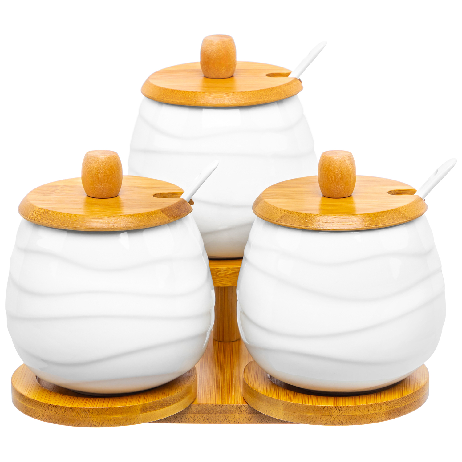 БЫЛО 1599 руб! Набор 3 банок д/хранения 400 мл 21*19*17 см "Айсберг волны" на дер. подставке + ложки