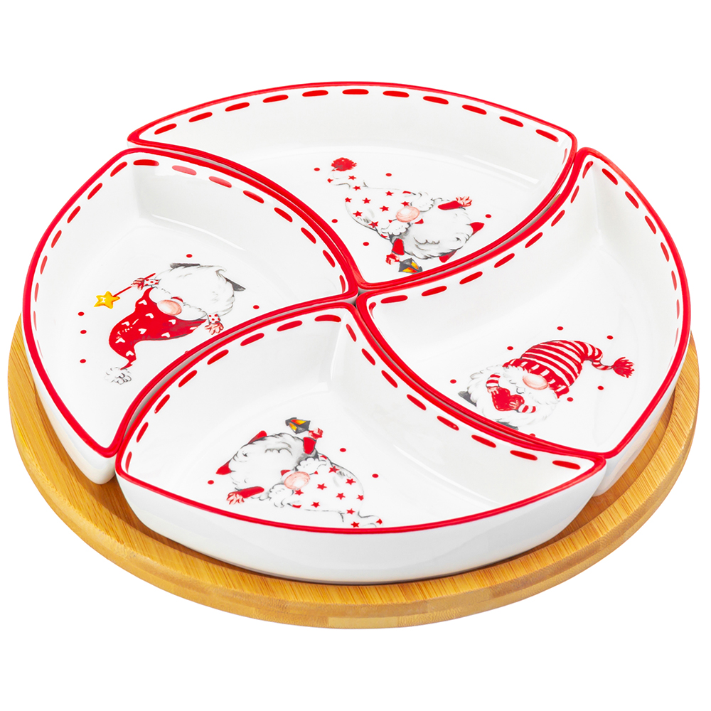 БЫЛО 1679 руб! Менажница 25*25*6 см "Весёлые гномики" крутящ. 4 секции на дерев. подставке