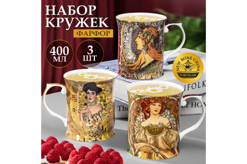 БЫЛО 1679 руб!! Набор кружек 3 пр. 400 мл 12,5*9*10 см "Золотая Адель" + "Зодиак" + "Мечтательность" NEW BONE CHINA