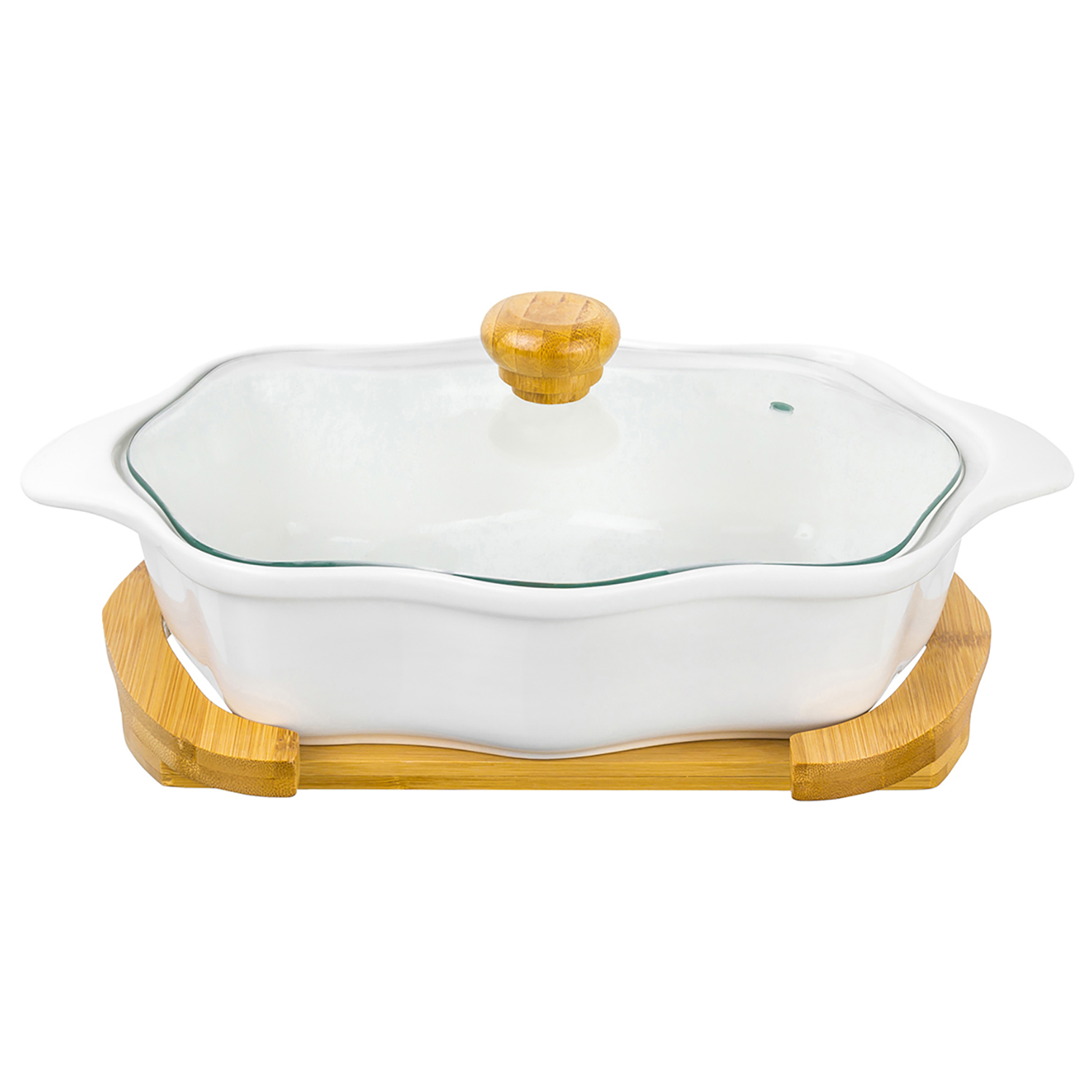 БЫЛО 2089 руб! Блюдо д/зап и серв 32*20*14 см 1,5 л "Айсберг" ажур. + стекл. крышка на дер. подставке