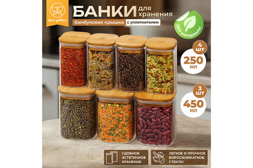 БЫЛО 2172 руб! Набор 7 банок д/хранения 3 пр. 450 мл + 4 пр. 250 мл "Crystal glass" + бамб.крышка с силик.прок.