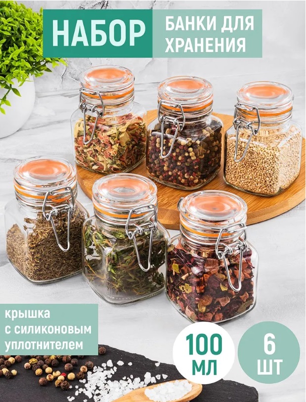 БЫЛО 487 руб! Набор 6 банок д/хранения 100 мл 5*5*8 см "Glaskraft" с крышками с металл.зажим. и сил.уплот.,стекло