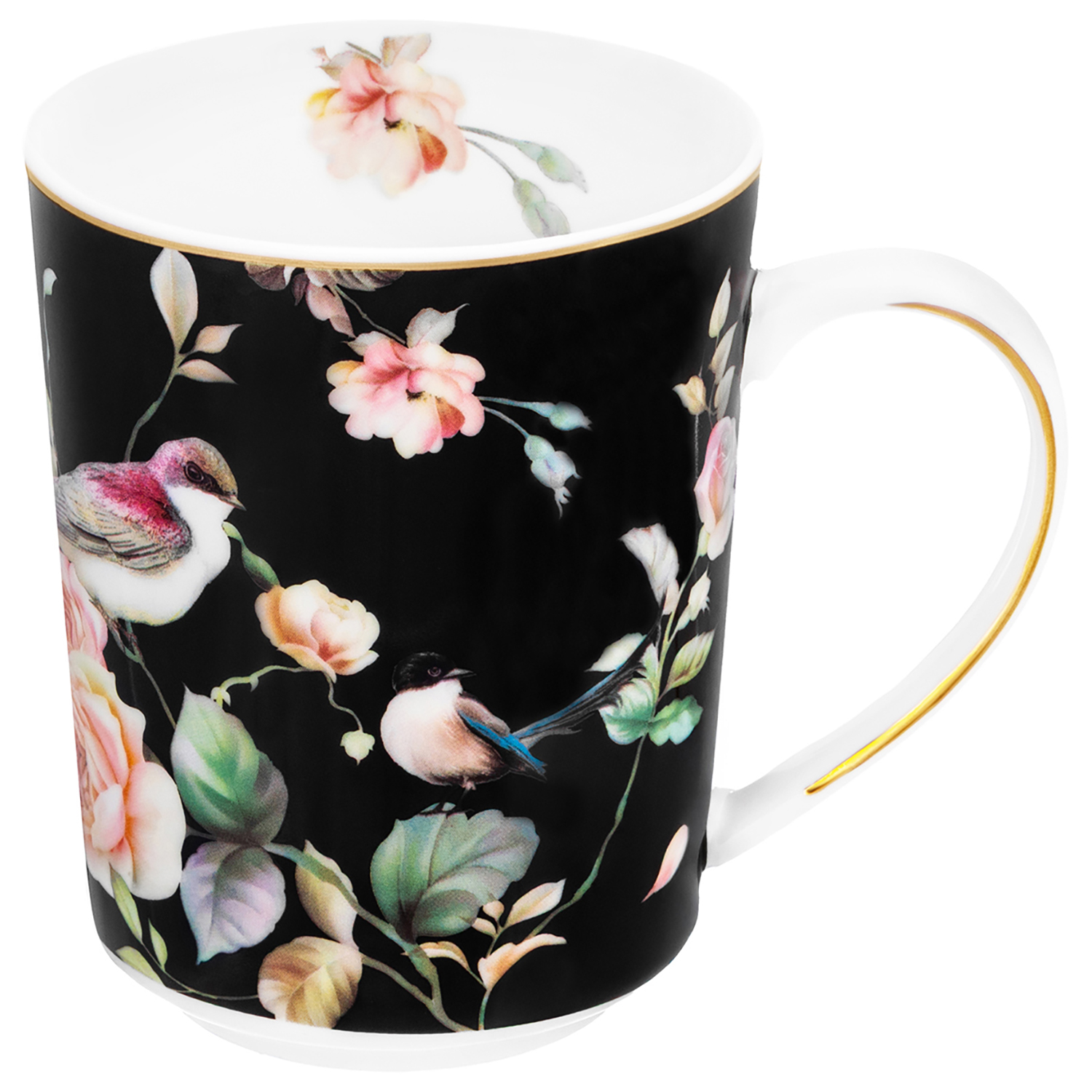 БЫЛО 543руб! Кружка 360 мл 12*8,5*10,5 см "Певчие птички на черном" NEW BONE CHINA