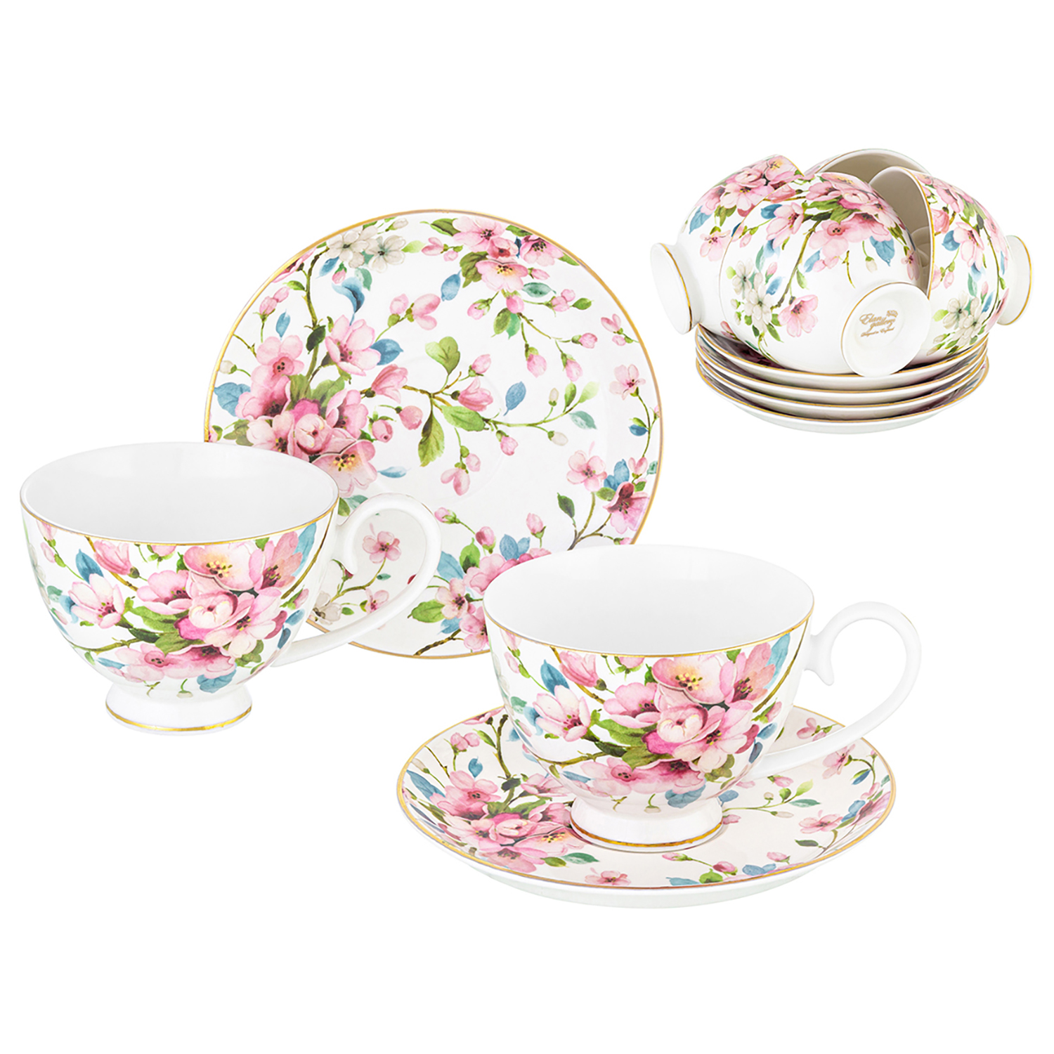 БЫЛО 5690 руб! Чайный набор 12 пр. 300 мл 12,5*9,5*7 см "Яблоневый цвет на белом" на ножке, фарфор NEW BONE CHINA