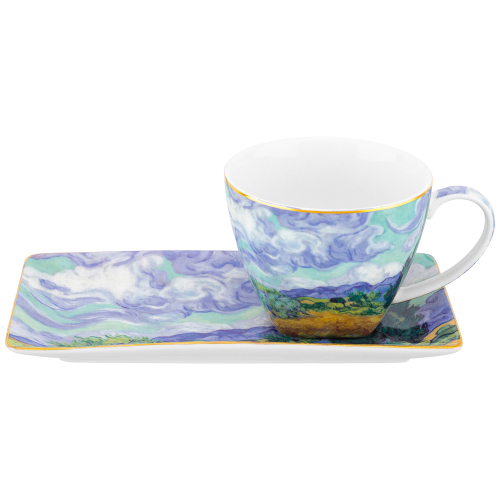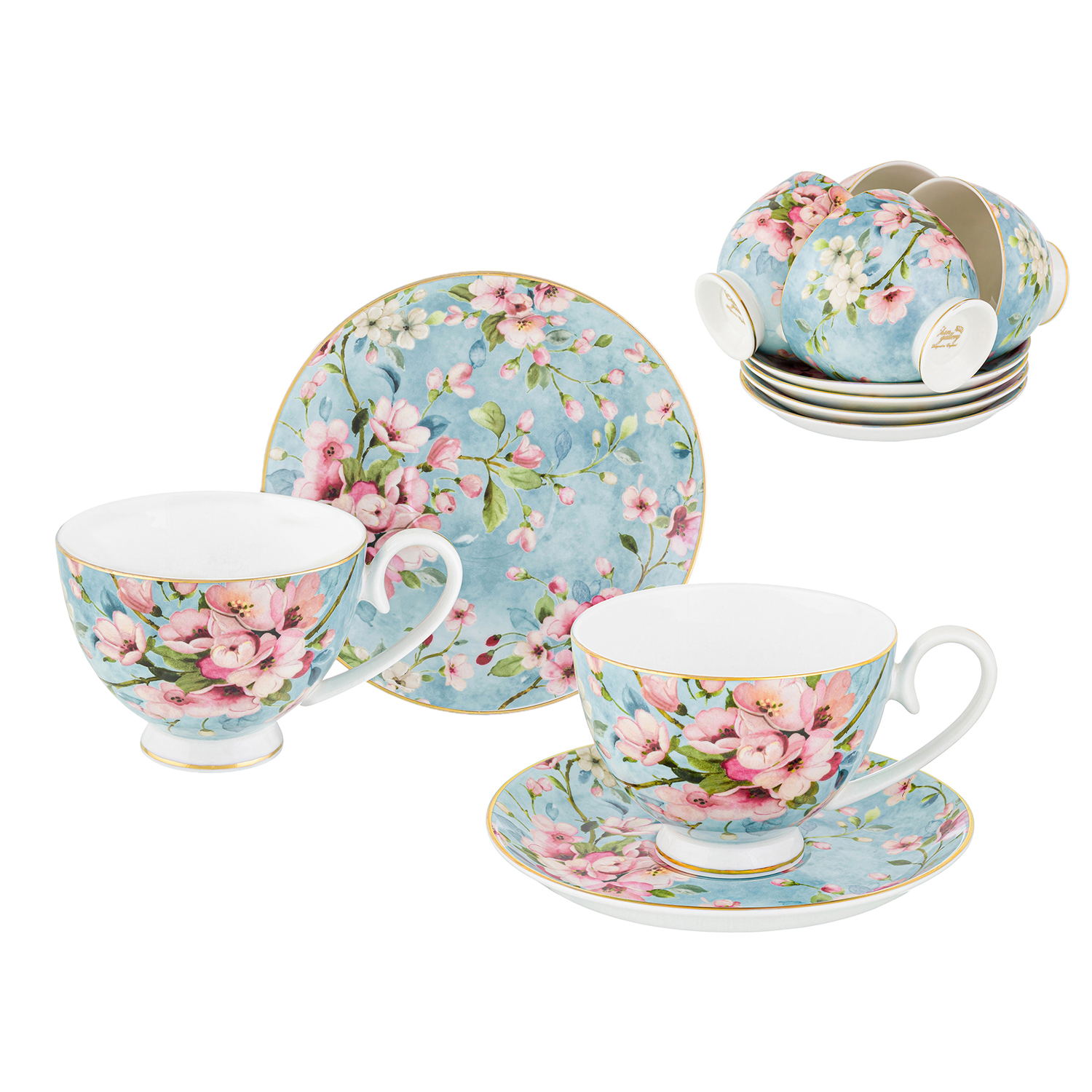 БЫЛО 5690 руб! Чайный набор 12 пр. 300 мл 12,5*9,5*7 см "Яблоневый цвет на голубом" на ножке, фарфор NEW BONE CHINA