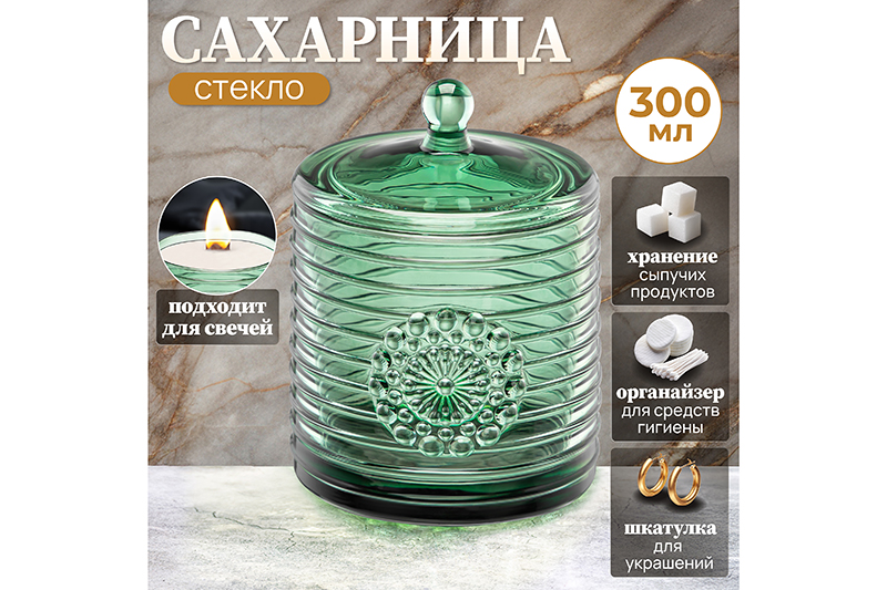 БЫЛО 583 руб! Сахарница 300 мл 8,5*8,5*12 см "Медальон" зеленый, стекло