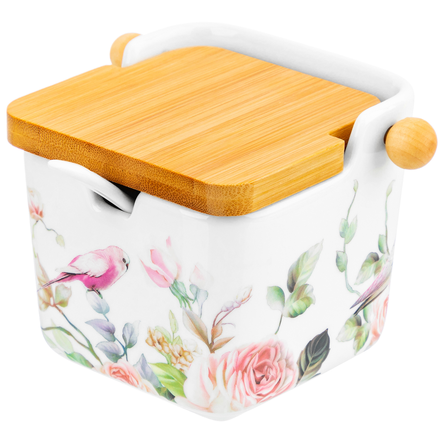 БЫЛО 641 руб!! Банка д/сыпучих продуктов 250 мл 12*9,5*9 см "Певчие птички"+ложка+откидная бамбук.крыш (без золота)