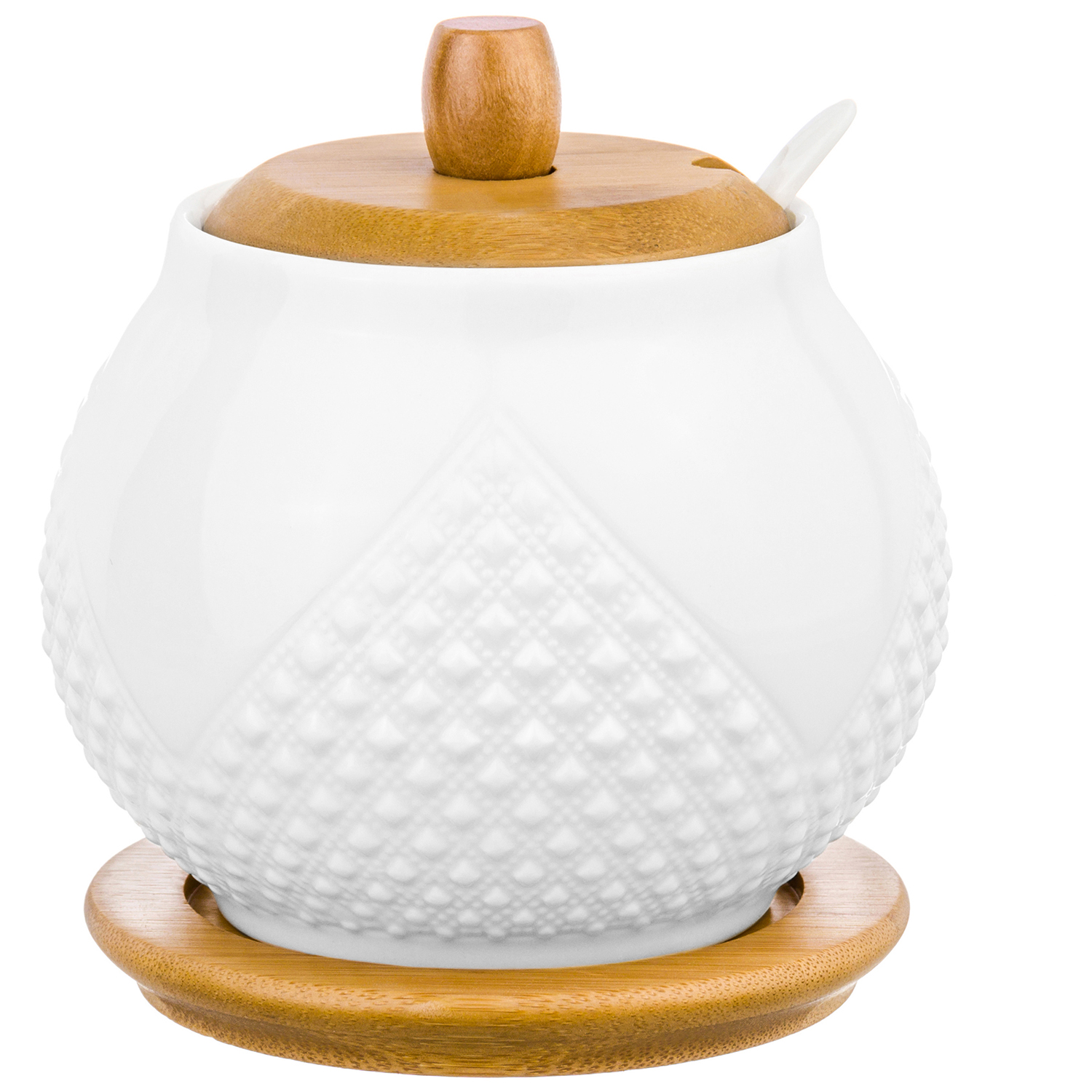 БЫЛО 679 руб! Сахарница 620 мл 11*11*12 см "Ромбики" с ложкой и дер. крышкой на дер. подставке