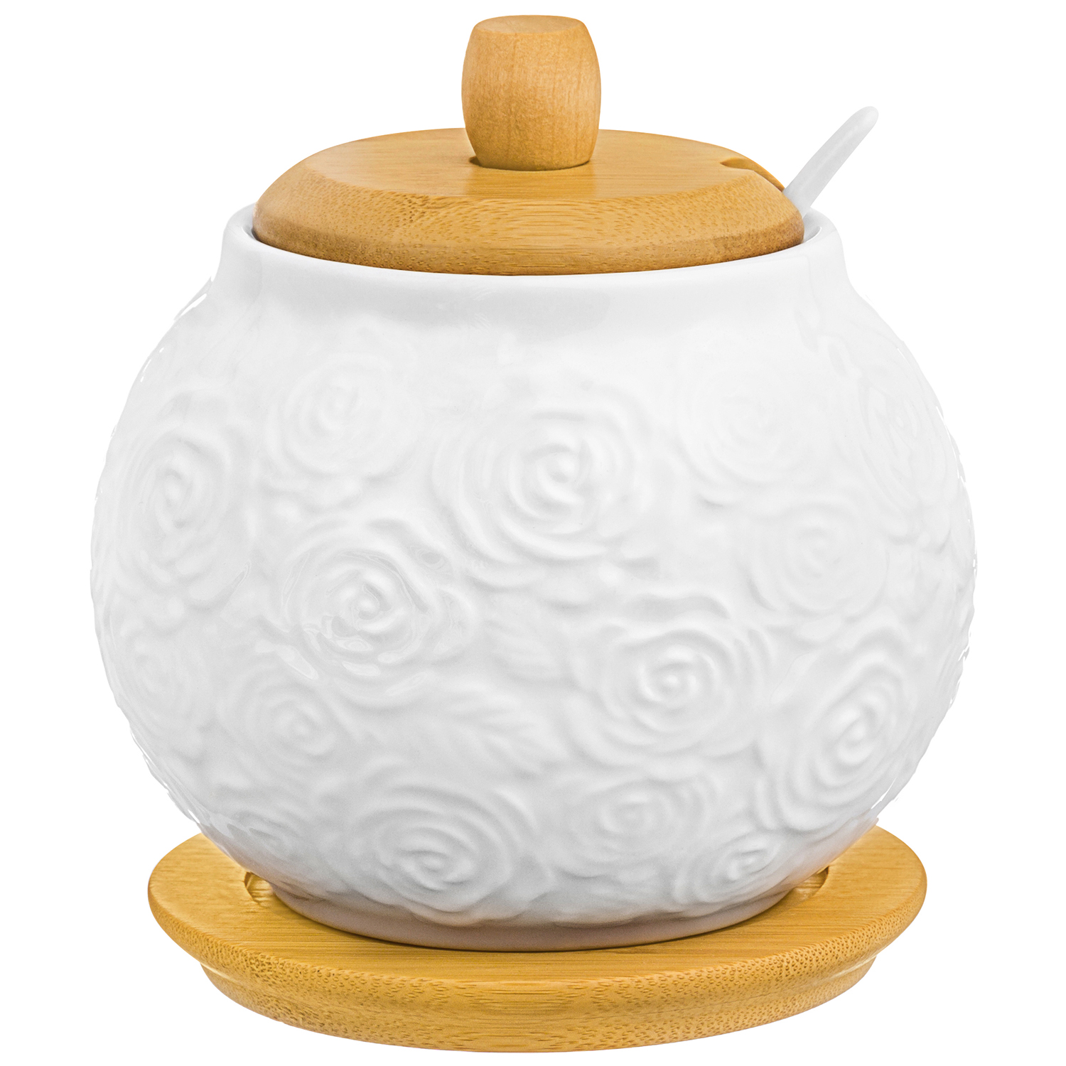БЫЛО 679 руб! Сахарница 620 мл 11*11*12 см "Розы" с ложкой и дер. крышкой на дер. подставке, фарфор