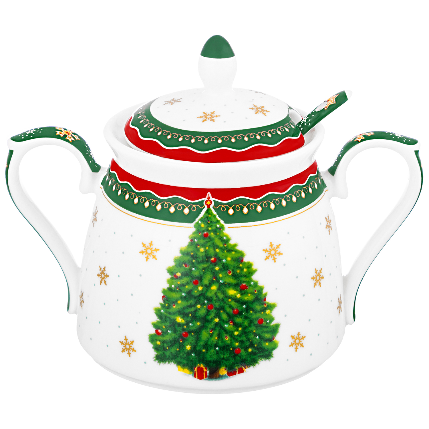 БЫЛО 801 руб! Сахарница 400 мл 15*10*11,5 см "Новогодняя елка" зеленый узор с ложкой, NEW BONE CHINA