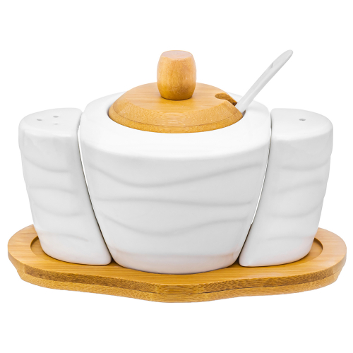 БЫЛО 999 руб! Набор - сахарница 300 мл 16*10*11 см "Айсберг волны" с ложкой + солонка + перечница на дер. подст.