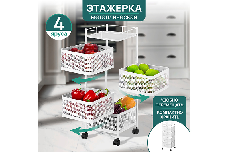 Четырёхъярусная этажерка ELCASA "Белая" размером 27х27х80 см на 4 колесах поможет создать порядок и организовать систему хранения в вашем доме. Размер этажерки без колесиков 27х27х75 см. Выполнена из металла. Размер каждого прямоугольного ящичка – 26х26х14 см, расстояние между ящиками – 2 см. Максимальная нагрузка на одну полочку – 5 кг. Высота от пола до нижней корзины без колес 3 см, с колесами – 7,5 см. Квадратные отсеки вращаются вокруг оси. Благодаря колесикам стеллаж с полочками удобно перемещать из одной комнаты в другую. Система тормоза в виде фиксаторов на 2 колесах позволит устойчиво закрепить положение этажерки в нужном месте. Мебель имеет универсальный дизайн, подойдёт к интерьеру в любом стиле. Мобильную этажерку с корзинками можно использовать для хранения вещей в комнате, на кухне и даже в детской. В прихожей можно положить в неё аксессуары: шапки, перчатки и шарфы. Подойдёт в роли обувницы для обуви и тапочек. Высокая этажерка с ящиками будет незаменима в гардеробной или на балконе в роли тумбы. На кухне можно использовать её для хранения овощей и фруктов. Каждая корзина может быть использована под разные фрукты и овощи. Декоративные отверстия на стенках позволяют воздуху проникать внутрь и не дадут продуктам испортиться от недостатка кислорода. В ванной подойдёт для хранения косметичек, бытовой химии или полотенец. Просто поставьте её возле раковины или стиральной машинки. В комнате в неё можно сложить книги, записные книжки или игрушки, используя как маленький шкафчик. В спальне послужит оригинальным туалетным столиком для баночек с косметикой. Можно использовать как прикроватную тумбочку, поставив на неё растения, лампу или предметы декора. В коллекции бренда ELCASA представлены функциональные органайзеры и другие товары для дома. Выберите вариант на свой вкус для создания комфорта в квартире и на даче. /