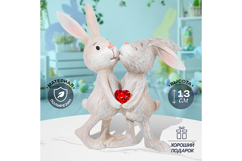 Декоративная фигурка «Парочка кроликов» от Elan Gallery преобразит любое помещение. Размер изделия – 12х5х13 см. Выполнена из полирезина – современного материала, который славится своей лёгкостью, устойчивостью к влаге и солнечным лучам. Он не выделяет вредных веществ и не имеет запаха. Полирезин легко поддаётся обработке, поэтому изделия из него отличаются своей реалистичностью и проработанной детализацией. Серый кролик целует в щёчку белую зайку, а в лапках они держат яркое гранёное сердце. Настольная фигурка дополнит и освежит антураж любой комнаты. Разместите маленькую статуэтку на полке, тумбочке или рабочем столе, задействуйте в композиции с декоративными веточками и растениями или другими фигурками. Она станет нежным и трогательным дополнением вашей квартиры. Не рекомендуется применять абразивные моющие средства. В коллекции бренда Элан Галерея вы найдёте множество как ярких, так и нежных декоративных украшений – каждый обязательно подберёт сувенир на свой вкус. Они станут чудесным подарком для родных, близких и коллег. Наполните пространство вокруг себя радостью! /