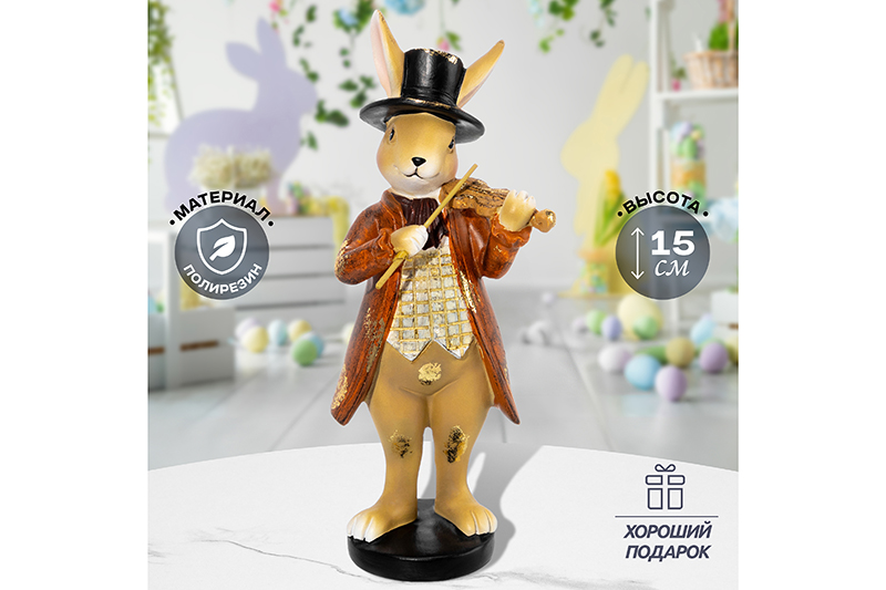 Декоративная фигурка «Кролик со скрипкой» от Elan Gallery преобразит любое помещение. Размер изделия – 6,5х5,5х15,5 см. Выполнена из полирезина – современного материала, который славится своей лёгкостью, устойчивостью к влаге и солнечным лучам. Он не выделяет вредных веществ и не имеет запаха. Полирезин легко поддаётся обработке, поэтому изделия из него отличаются своей реалистичностью и проработанной детализацией. Статный кролик-скрипач одет в оранжевый камзол и изысканный цилиндр. Его одежда и ушки покрыты декоративной позолотой, создающей эффект старины. Настольная фигурка дополнит и освежит антураж любой комнаты. Разместите маленькую статуэтку на полке, тумбочке или рабочем столе, задействуйте в композиции с декоративными веточками и растениями или другими фигурками. Изысканный кролик вдохновит вас своим очарованием и наполнит светлыми и нежными чувствами. Не рекомендуется применять абразивные моющие средства. В коллекции бренда Элан Галерея вы найдёте множество как ярких, так и нежных декоративных украшений – каждый обязательно подберёт сувенир на свой вкус. Они станут чудесным подарком для родных, близких и коллег. Наполните пространство вокруг себя радостью! /