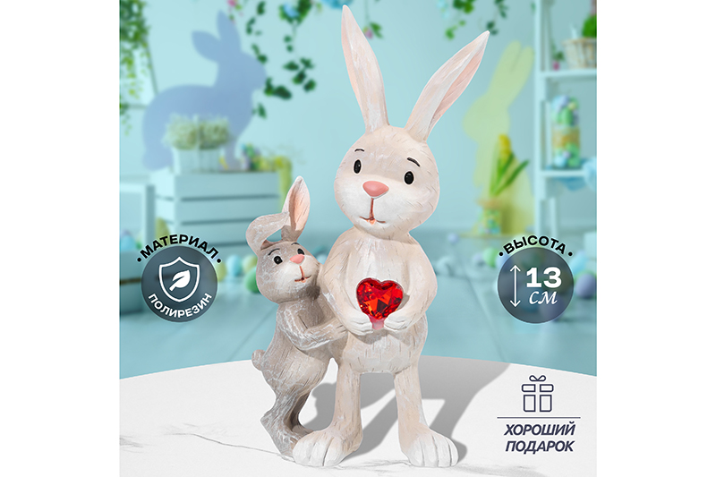 Декоративная фигурка «Зайка и зайчонок» от Elan Gallery преобразит любое помещение. Размер изделия – 7х5х13,5 см. Выполнена из полирезина – современного материала, который славится своей лёгкостью, устойчивостью к влаге и солнечным лучам. Он не выделяет вредных веществ и не имеет запаха. Полирезин легко поддаётся обработке, поэтому изделия из него отличаются своей реалистичностью и проработанной детализацией. Маленький серый зайчонок доверчиво прижимается к маме-зайке, которая держит яркое гранёное сердце. Настольная фигурка дополнит и освежит антураж любой комнаты. Разместите маленькую статуэтку на полке, тумбочке или рабочем столе, задействуйте в композиции с декоративными веточками и растениями или другими фигурками. Она станет нежным и трогательным дополнением вашей квартиры. Не рекомендуется применять абразивные моющие средства. В коллекции бренда Элан Галерея вы найдёте множество как ярких, так и нежных декоративных украшений – каждый обязательно подберёт сувенир на свой вкус. Они станут чудесным подарком для родных, близких и коллег. Наполните пространство вокруг себя радостью! /
