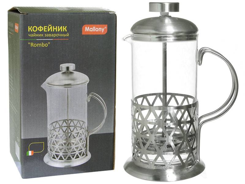 Кофе-пресс 350мл серия Rombo тм Mallony• предназначен для заваривания чая, кофе, прочих напитков.• корпус/фильтр/стержень из нержавеющей стали № 201, колба из жаропрочного боросиликатного стекла.• крышка - нержавеющая сталь № 201/пластмасса• толщина стекла - 2 мм• толщина нерж стали - 0,30 мм• объем - 350 млЗаключаем договора по 44 ФЗ, 223 ФЗ