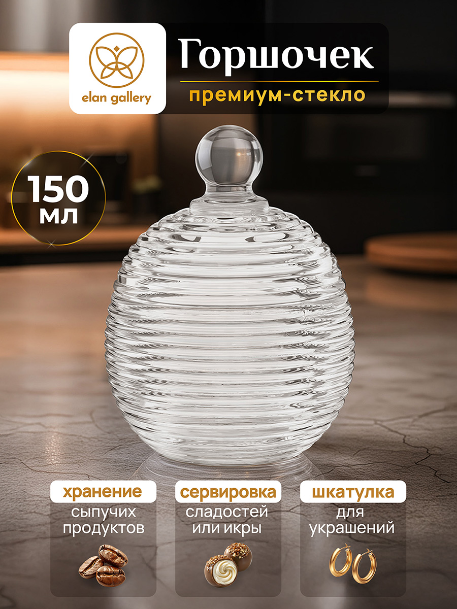 Горшочек для мёда Elan Gallery "Каскад" с крышкой выполнен из стекла и украшен декоративным рельефным узором в виде горизонтальных полосок. Размер изделия – 8,2х8,2х11 см, объём – 150 мл. Высота без крышки – 5,2 см. Прозрачная баночка с полосатым рельефом подойдёт для хранения мёда, варенья, сахара и соли. Можно использовать её как ёмкость для чая, кофе и других сыпучих продуктов. Декоративная баночка круглой формы станет гармоничным дополнением при сервировке вашего стола как в будни, так и на праздник. Красивый дизайн позволит использовать её не только для хранения продуктов, но и для подачи на стол. Положите в неё конфеты или икру, чтобы удивить гостей изящной сервировкой. Стеклянную ёмкость с крышечкой можно использовать не только как сахарницу, икорницу или соусник, но и для специй и приправ. Это позволит держать под рукой всё необходимое во время приготовления и приёма пищи. На даче медовница будет незаменимой для семейного чаепития, а также подойдёт для подачи ягод. В качестве альтернативы красивую вазочку с крышкой можно использовать как шкатулку или органайзер. Сложите в неё украшения и любые маленькие предметы. Подходит в роли стакана для свечи. Не рекомендуется применять абразивные моющие средства. Нельзя использовать в микроволновой печи. Можно мыть в посудомоечной машине. Поставляется в стильной картонной упаковке. Красивая посуда – это отличный подарок на любой праздник. Медовый бочонок "Каскад" станет многофункциональным дополнением вашего кухонного инвентаря и украсит домашний интерьер!