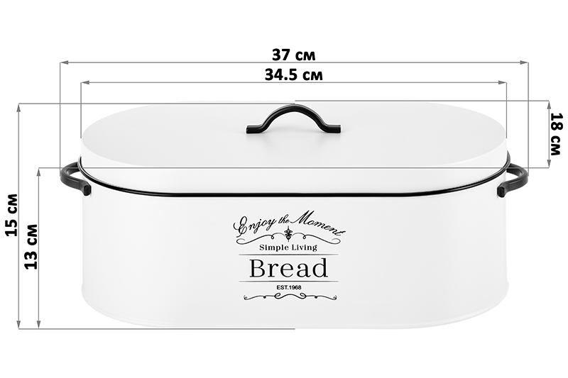 Стильная хлебница 34,5х18х15 см белого цвета с чёрными надписями выполнена из металла и поможет сохранить хлеб и булочки вкусными и свежими. Металлическая хлебница не впитывает запахи, держит температуру, предотвращает попадание влаги, а значит – защитит продукты от плесени. Настольная хлебница имеет стильный дизайн овальной формы с удобными ручками по бокам, надежно закрывается крышкой. Ёмкость можно приспособить не только под хлеб, но и для хранения пакетов с крекерами, печеньем, сухарями, конфетами, мармеладом и другими сладостями. Поставляется в стильной картонной упаковке. Металлическая хлебница подойдёт в подарок любой хозяйке. Такая посуда станет настоящим украшением вашей кухни и поможет создать в доме порядок и уют!