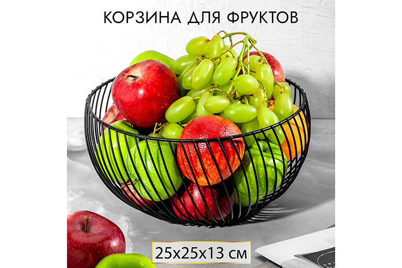 Декоративная корзина для фруктов ELCASA 25,5х25,5х13 см изготовлена из прочного металла с пудровым покрытием. Внутренний диаметр корзинки 25 см, диаметр круглого металлического основания 9 см. Фруктовница чёрного цвета имеет стильный, но универсальный дизайн. Круглая чаша в виде металлической сетки подойдёт для хранения и сервировки яблок, бананов, апельсинов и мандаринов. Металлическое блюдо – это универсальное решение для интерьера вашего дома или офиса. Можно разместить в вазе свежие фрукты или виноград на кухне, а также украсить корзинкой гостиную или приемную. Фруктовница эстетично впишется в самые разные стили интерьера: лофт, сканди, минимализм и подойдёт для эстетичного хранения урожая из вашего сада. Удобный кухонный аксессуар для сервировки поможет организовать порядок на кухне. Сервировочная фруктовая подставка не только дополнит декор праздничного стола, но и подойдет для пикника или дачи. Такая стильная посуда порадует ваших гостей и сделает застолье еще приятнее! Органайзер подойдёт для хранения конфет и других сладостей в пакетах в роли большой конфетницы. Не рекомендуется применять абразивные моющие средства. Нельзя мыть в посудомоечной машине. Красивая настольная корзина для овощей, фруктов и ягод станет приятным подарком на любой праздник. Подарите стильный кухонный инвентарь своим близким – такая вещь всегда пригодится в быту. Сетчатая корзина для фруктов станет украшением вашей столовой или приятным сюрпризом для родных и близких! /