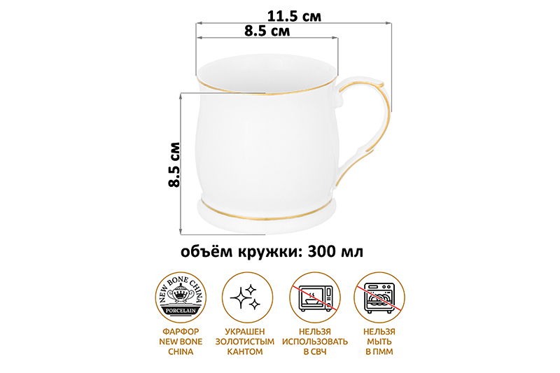 Кружка 300 мл 11,5*8,5*8,5 см "Белая с золотом" NEW BONE CHINA