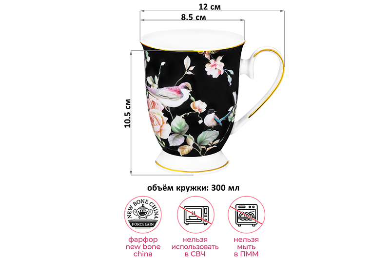Кружка 300 мл 12*8,5*10,5 см "Певчие птички на черном" на ножке NEW BONE CHINA