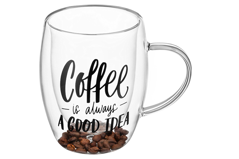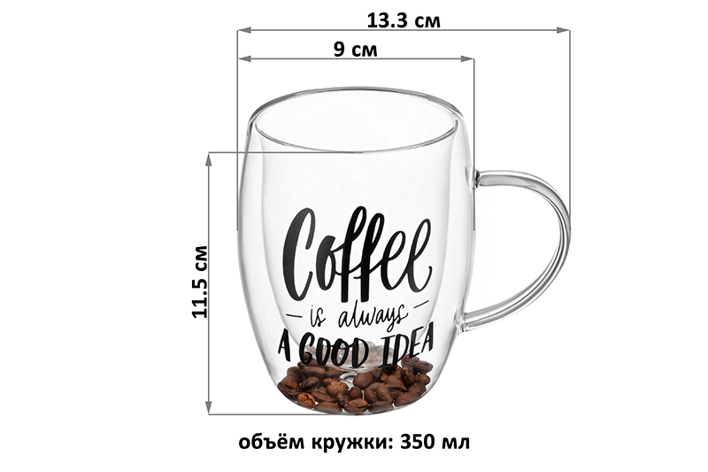 Кружка с двойными стенками Elan Gallery "Crystal glass" размером 13,3х9х11,5 см и объёмом 350 мл поможет провести множество уютных чаепитий или приятных завтраков с любимым кофе. Выполнена из термостойкого боросиликатного стекла, внутри имеет декоративный наполнитель из натуральных кофейных зёрен. Украшена надписью "Coffee is always a good idea" ("Кофе – это всегда хорошая идея!") В такой посуде красиво выглядит не только фруктовый сок, но даже простая вода. Летом поможет освежиться прохладными напитками, например, лимонадом или коктейлем. Зимой согреет ароматным глинтвейном или чаем. Можно использовать для сервировки десерта, например, мороженого. А как красиво будет выглядеть в кружечке с декором капучино или латте! Благодаря специальной конструкции внешняя сторона не нагревается от кипятка и не охлаждается от ледяной воды. Напитки в прозрачной кружке с принтом выглядят яркими и красивыми! Бокал с двойным дном можно использовать как чайный или кофейный. Создайте себе атмосферу праздника даже в обычный пасмурный день! Не рекомендуется применять абразивные моющие средства. Нельзя использовать в микроволновой печи и посудомоечной машине. Поставляется в стильной картонной коробке. Стеклянный жаропрочный бокал с ручкой станет украшением вашей кухни или приятным подарком. Благодаря красочной коробочке не понадобится дополнительная подарочная упаковка. Сделайте сюрприз себе и своим близким. В коллекции бренда Элан Галерея представлено много стильных товаров для дома, в том числе красивых чашек. Выберите варианты на свой вкус!