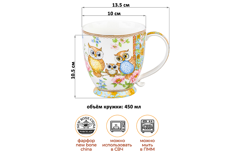 Кружка 450 мл 13,5*10*10,5 см "Совушки" на ножке, NEW BONE CHINA