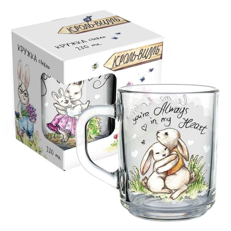 Кружка «Кроль-Вилль. Любовь в сердце» 230 мл изготовлена из прозрачного стекла и украшена рисунком кроликов в пастельных тонах. Дизайн кружки вручную отрисован нашей художницей.