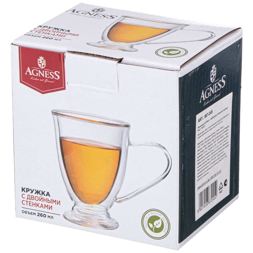 Бренд AGNESS представляет Вашему вниманию коллекцию стеклянной посуды с двойными стенками DOUBLE-WALL. В данной коллекции имеются кружки и стаканы различных форм и объемов. Благодаря двойным стенкам, кружки и стаканы DOUBLE-WALL долго сохраняют температуру горячих напитков, а стенки изделия не нагреваются, обеспечивая комфорт и безопасность использования. При этом кружки и стаканы DOUBLE-WALL прекрасно подходят и для холодных напитков или десертов – благодаря двойным стенкам содержимое дольше не нагревается и сохраняет все свои качества.